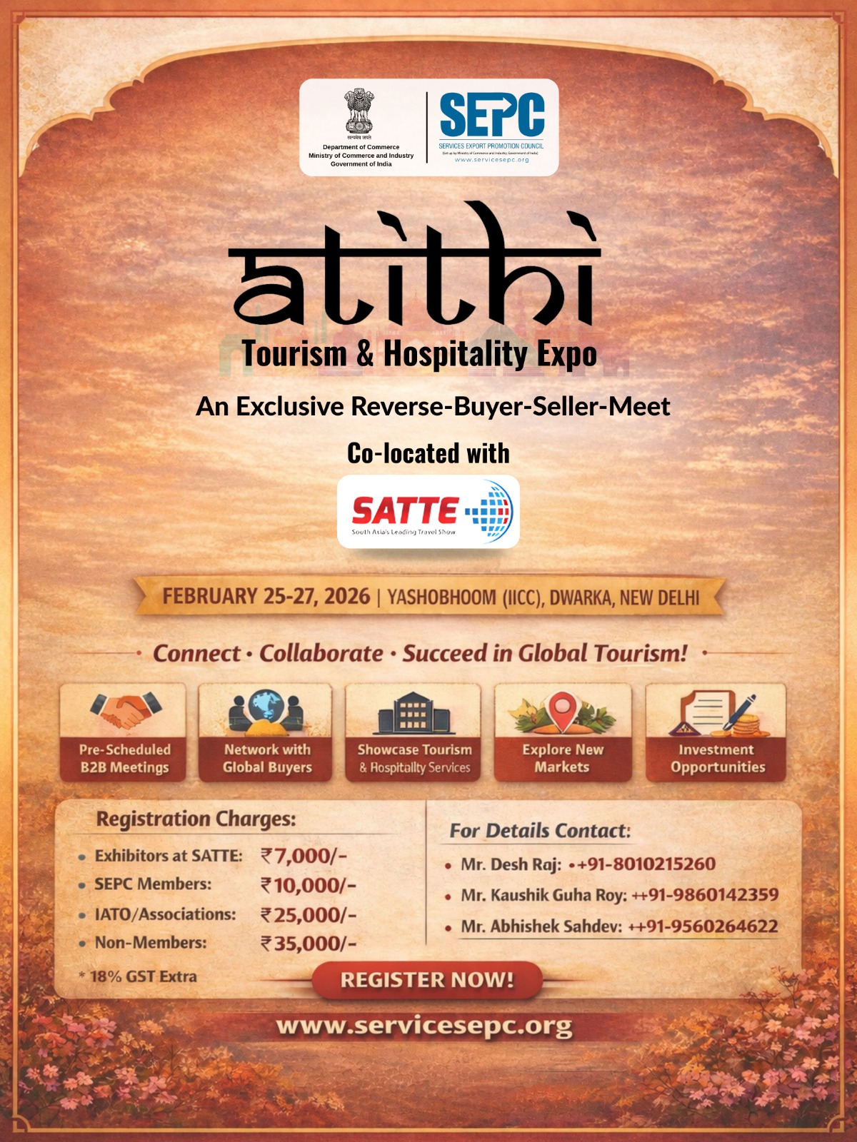 ATITHI, is aimed to be one of the India’s leading in-house brand, an international mega event on travel, tourism, hospitality, and India's cultural heritage, which aims to promote innovation and excellence in the tourism sector. The event will provide a global platform for bilateral trade, technology transfer, and capacity building for the next generation of the industry. ATITHI will showcase the Ministry of Tourism's Policies, Programmes & Milestones and attract over 150+ Indian and international exhibitors from different tourism verticals, 1000+ foreign delegates from 30+ countries, and 10000+ Indian delegates from different states & UTs. The event will be a great opportunity to showcase the potential of India's travel and tourism industry and attract investments to boost its growth.